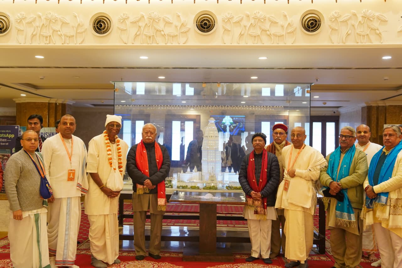उन्होंने कहा कि संघ एवं चंद्रोदय मंदिर से जुड़े भक्तों का उद्देश्य केवल धार्मिक गतिविधियों तक सीमित नहीं है, बल्कि व्यक्तित्व निर्माण, संस्कारयुक्त शिक्षा, सेवा और सामाजिक समरसता के माध्यम से भारत को पुनः विश्व के आध्यात्मिक केंद्र के रूप में प्रतिष्ठित करना है, जानकारी देते हुए चंद्रोदय मंदिर के जनसंपर्क प्रमुख भरतर्षभा दास ने बताया कि पूज्य मोहन भागवत जी ने मंदिर में दर्शन के उपरांत श्रील प्रभुपाद के विग्रह पर पुष्पार्चन कर उन्हें श्रद्धांजलि अर्पित की, वहीं चेयरमैन मधु पंडित दास एवं अध्यक्ष चंचलापति दास द्वारा उन्हें श्रील प्रभुपाद द्वारा रचित भगवद्गीता यथारूप के विभिन्न संस्करणों का अवलोकन कराया गया जिनमें विभिन्न भाषाओं में प्रकाशित ग्रंथ शामिल थे, इस दौरान उन्होंने निर्माणाधीन चंद्रोदय मंदिर के प्रतिरूप का भी अवलोकन किया ।