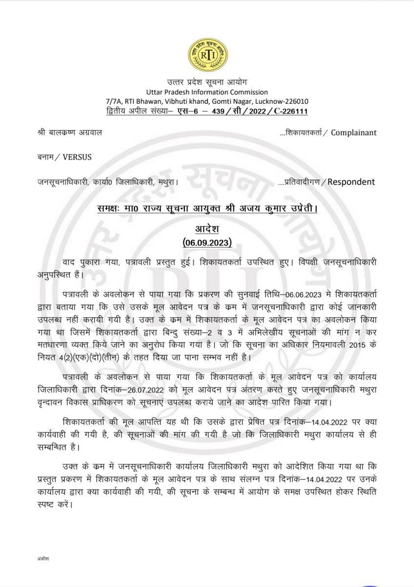 दरअसल बालकृष्ण अग्रवाल द्वारा विगत वर्ष 14 अप्रेल को जिलाधिकारी को एक शिकायती पत्र प्रेषित किया गया था जिसमें उन्होंने शहर के आवासीय क्षेत्र डैम्पियर नगर में बड़ी संख्या में व्यवसायिक निर्माणों की शिकायत करते हुए विधिपूर्वक कार्यवाही किये जाने की मांग की गई थी, शिकायतकर्ता बालकृष्ण अग्रवाल ने अपने शिकायती पत्र पर जिलाधिकारी कार्यालय से कार्यवाही के सम्बंध में 18 जुलाई 2022 को सूचना का अधिकार के अंतर्गत जानकारी मांगी जिसको जिलाधिकारी कार्यालय द्वारा मथुरा वृन्दावन विकास प्राधिकरण को अंतरित कर दिया जिसपर जिलाधिकारी कार्यालय को प्रथम अपील दाखिल करते हुए आपत्ति व्यक्त की, उसे भी जिलाधिकारी कार्यालय द्वारा मथुरा वृन्दावन को स्थान्तरित कर दिया लेकिन सूचना उपलब्ध नहीं कराई गई ।