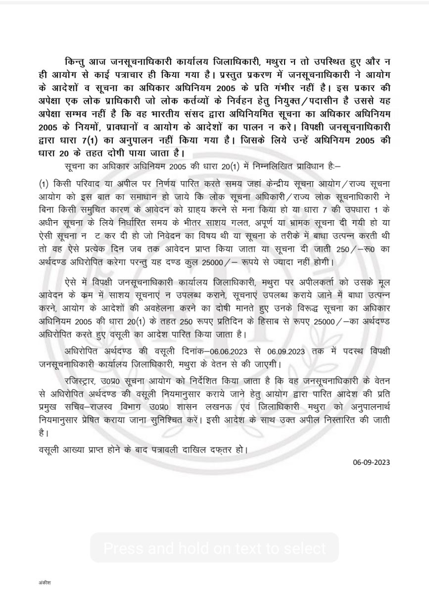 राज्य सूचना आयुक्त अजय कुमार उप्रेती द्वारा 6 सितम्बर को हुई सुनवाई के दौरान बालकृष्ण अग्रवाल द्वारा आवेदित उक्त प्रकरण पर गहन अध्ययन करते हुए जनसूचना अधिकारी जिलाधिकारी कार्यालय मथुरा को सूचना का अधिकार अधिनियम के सम्बंध में गम्भीरता नही बरतने के साथ ही राज्य सूचना आयोग के आदेश की अवहेलना किया जाना मानते हुए सूचना का अधिकार अधिनियम की धारा 20(1) के अंतर्गत 25 हजार रुपये का अर्थदण्ड अधिरोपित किया गया है, हालांकि राज्य सूचना आयुक्त द्वारा जनसूचना अधिकारी जिलाधिकारी कार्यालय मथुरा के विरुद्ध अधिनियम की धारा 20(2) की कार्यवाही नहीं की गई है जबकि जनसूचना अधिकारी पर सूचना का अधिकार अधिनियम की धारा 20(1) के साथ ही धारा 20(2) के अंतर्गत अनुशासनात्मक कार्यवाही किये जाने का भी प्रावधान है, वहीं गौरतलब है कि इसी वर्ष की दो अगस्त को भी राज्य सूचना आयुक्त द्वारा आरटीआई एक्टिविस्ट बालकृष्ण अग्रवाल की शिकायत पर जनसूचना अधिकारी जिलाधिकारी कार्यालय पर 25 हजार रुपये का अर्थदण्ड अधिरोपित किया गया था, इसी तरह से सूचना का अधिकार के मामलों पर जनसूचना अधिकारी जिलाधिकारी कार्यालय द्वारा गम्भीरता नही बरते जाने के तमाम उदाहरण हैं जिसकी वजह से तमाम आरटीआई कार्यकर्ताओं को राज्य सूचना आयोग लखनऊ तक दौड़भाग करने को विवश होना पड़ रहा है ।