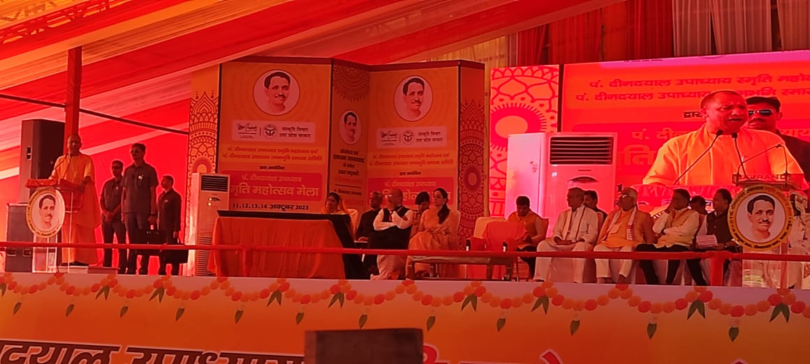 इससे पूर्व मुख्यमंत्री योगी आदित्यनाथ ने पं0 दीनदयाल उपाध्याय के चित्रपट के सम्मुख मंत्रोच्चारण के साथ दीप प्रज्वलित कर पुष्पार्चन किया और श्रृद्धांजलि अर्पित की, मुख्यमंत्री के मंच पर आते ही जनसमूह ने खड़े होकर भारत माता की जय, पं0 दीनदयाल उपाध्याय की जय के गगनभेदी नारे लगाकर स्वागत किया, संस्कृति विभाग के कलाकारों द्वारा संघ की ध्वनि व ढोल बजाकर स्वागत किया, समिति के पदाधिकारियों ने मुख्यमंत्री का स्मृति चिन्ह केसरिया शाल ओढ़ाकर स्वागत किया, मंच पर मुख्यमंत्री योगी के साथ सांसद हेमामालिनी, कैबिनेट मंत्री लक्ष्मी नारायण चौधरी, स्मारक समिति अध्यक्ष मधुसूदन दादू, महोत्सव समिति अध्यक्ष एडवोकेट सोहन लाल शर्मा, कामधेनु गौशाला समिति अध्यक्ष महेश गुप्ता, ग्राम प्रधान सविता पाठक, दीपचंद प्रगतिशील किसान उपस्थित रहे, सभा में राष्ट्रीय स्वयंसेवक संघ के प्रचारक महेन्द्र शर्मा, प्रांत प्रचारक हरीश रौतेला, निदेशक सोनपाल, उ0 प्र0 बाल अधिकार संरक्षण आयोग के अध्यक्ष देवेंद्र शर्मा, विधायक पूरन प्रकाश, विधायक राजेश चौधरी, विधायक मेघश्याम, महापौर विनोद कुमार अग्रवाल, पूर्व विधायक कारिंदा सिंह, महेश गोयल, शिवकुमार, योगेश आवा, आचार्य ब्रजेंद्र नागर, प्रचार प्रमुख मुकेश शर्मा, अंशुल गोस्वामी के अलावा भाजपा व संघ के पदाधिकारी, कार्यकर्ता और हजारों की संख्या में किसान उपस्थित रहे, मंच का संचालन मंत्री मनीष अग्रवाल ने एवं धन्यवाद ज्ञापन कोषाध्यक्ष नरेंद्र पाठक ने किया ।