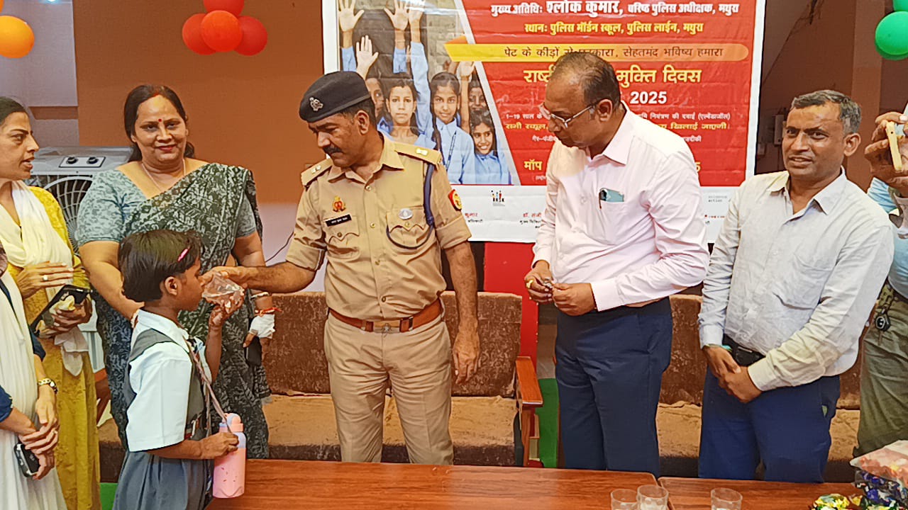 मथुरा । जनपद में स्वास्थ्य विभाग द्वारा मुख्य चिकित्सा अधिकारी डॉ0 संजीव यादव के मार्गदर्शन में राष्ट्रीय कृमि मुक्ति दिवस पर सोमवार से राष्ट्रीय कृमि मुक्ति दिवस अभियान शुरू हो गया है, अभियान का शुभारंभ पुलिस मॉडर्न पब्लिक स्कूल सिविल लाइन में पुलिस अधीक्षक यातायात मनोज यादव द्वारा उपस्थित बच्चों को एलबेंडाजोल की गोली खिलाकर किया गया, शहरी व ग्रामीण क्षेत्रों में स्थित निजी एवं सरकारी विद्यालयों और आंगनवाड़ी केन्द्रों पर बच्चों को अल्बेंडाज़ोल की गोली खिलाई गई ।
