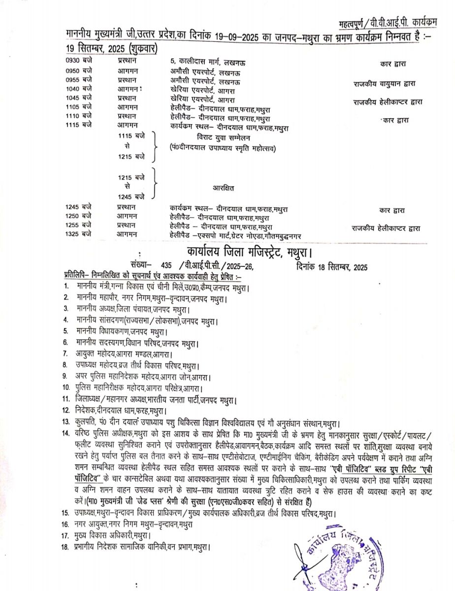 जिला प्रशासन का कहना है कि मुख्यमंत्री के आगमन के समय किसी भी प्रकार की लापरवाही बर्दाश्त नहीं की जाएगी, तय कार्यक्रम के अनुसार मुख्यमंत्री कल सुबह 11 बजकर 10 मिनट पर हेलीकॉप्टर से दीनदयाल धाम के हैलीपेड पर पहुंचेंगे, मुख्यमंत्री योगी आदित्यनाथ शुक्रवार को मथुरा दौरे पर आ रहे हैं, उनका कार्यक्रम फरह क्षेत्र स्थित पंडित दीनदयाल धाम में रहेगा, मुख्यमंत्री के आगमन को लेकर प्रशासन ने सभी तैयारियां पूरी कर ली हैं और सुरक्षा व्यवस्था भी कड़ी कर दी गई है।