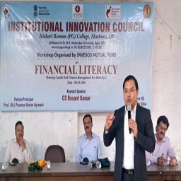 मथुरा । किशोरी रमण कॉलेज की इंस्टीट्यूशन इनोवेशन कौंसिल और इंनवेस्को म्यूचुअल फंड के संयुक्त तत्वावधान में फाइनेंशियल लिट्रेसी विषय पर वर्कशॉप का आयोजन किया गया, इस वर्कशॉप का शुभारंभ प्रो0 अनिल सक्सैना द्वारा उपस्थित अतिथियों के परिचय के साथ कराया गया, इनोवेशन काउंसिल के संयोजक डॉ0 प्रवीण ओझा ने इस वर्कशाप के उद्देश्यों से सभी विद्यार्थियों और श्रोताओं को अवगत कराया ।