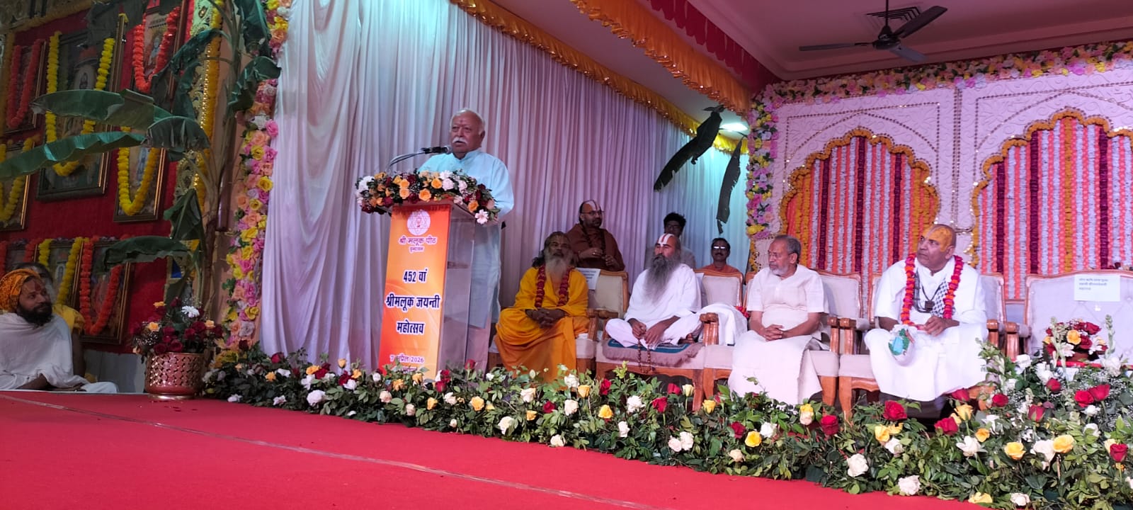 वृंदावन । संत मलूक दास महाराज के 452वें जयंती महोत्सव में संघ प्रमुख मोहन भागवत ने कहा कि भारत अपनी आध्यात्मिक परंपराओं और संतों के मार्गदर्शन से विश्व को नई दिशा देने में सक्षम है, उन्होंने कहा कि देश की प्राचीन संस्कृति और संतत्व ही दुनिया को सुख, शांति और सुंदरता का मार्ग दिखा सकते हैं, भागवत ने पश्चिम एशिया में बढ़ती अशांति का उल्लेख करते हुए कहा कि अब समय आ गया है जब भारत विश्व गुरु की भूमिका निभाए, इसके लिए संतों की शिक्षाओं, करुणा और सत्य के मूल्यों को अपनाना आवश्यक है ।