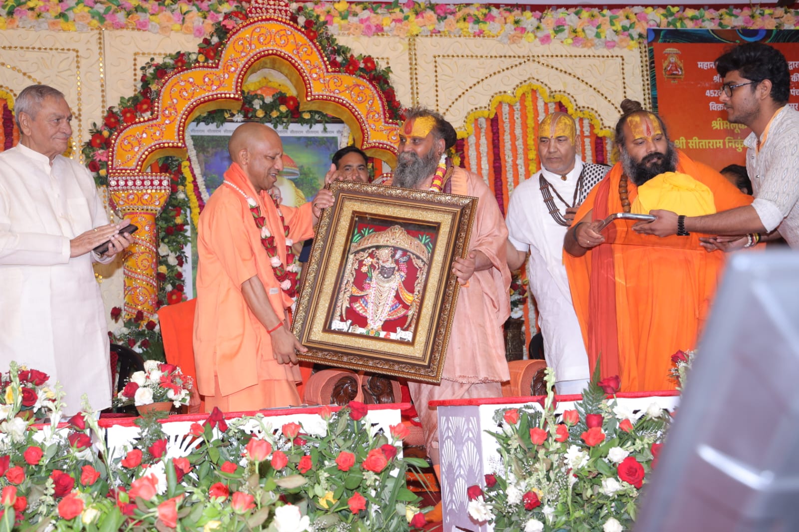 उत्तर प्रदेश के मुख्यमंत्री योगी आदित्यनाथ भी समारोह में शामिल हुए, मौसम की प्रतिकूल परिस्थितियों के बावजूद उनका कार्यक्रम यथावत रहा और प्रशासन पूरी तरह सतर्क नजर आया, मुख्यमंत्री का हेलीकॉप्टर पवन हंस हेलीपैड पर उतरा जहां पहले से ही सुरक्षा के कड़े इंतजाम किए गए थे, उनके आगमन को लेकर प्रशासनिक अमले के साथ बड़ी संख्या में जनप्रतिनिधि और पार्टी पदाधिकारी मौजूद रहे, हेलीपैड पर मुख्यमंत्री का स्वागत योग गुरु बाबा रामदेव, कैबिनेट मंत्री चौधरी लक्ष्मी नारायण, राज्यसभा सांसद तेजवीर सिंह, विधायक राजेश चौधरी, पूरन प्रकाश, ठा0 मेघश्याम, योगेश नौहवार, महापौर विनोद अग्रवाल, पूर्व मेयर मुकेश आर्य बंधु, भाजपा जिलाध्यक्ष निर्भय पांडे, महानगर अध्यक्ष राजू यादव, उत्तर प्रदेश ब्रज तीर्थ विकास परिषद के उपाध्यक्ष शैलजा कांत मिश्रा तथा डीएम सीपी सिंह सहित जनप्रतिनिधियों द्वारा किया गया ।