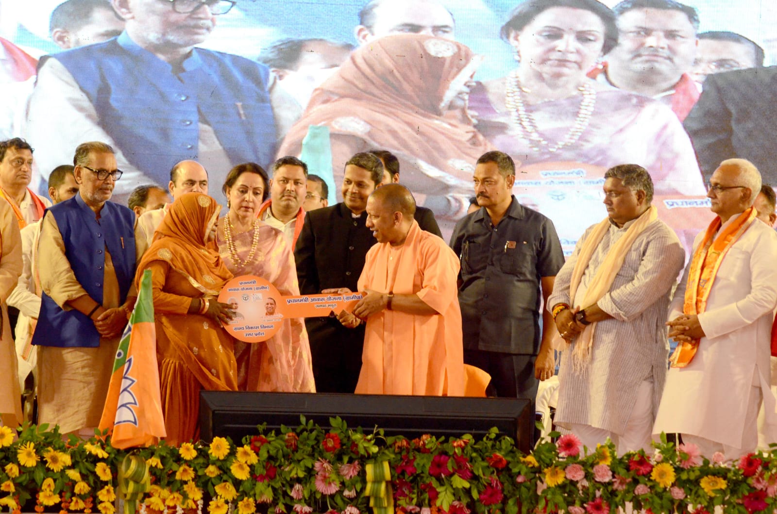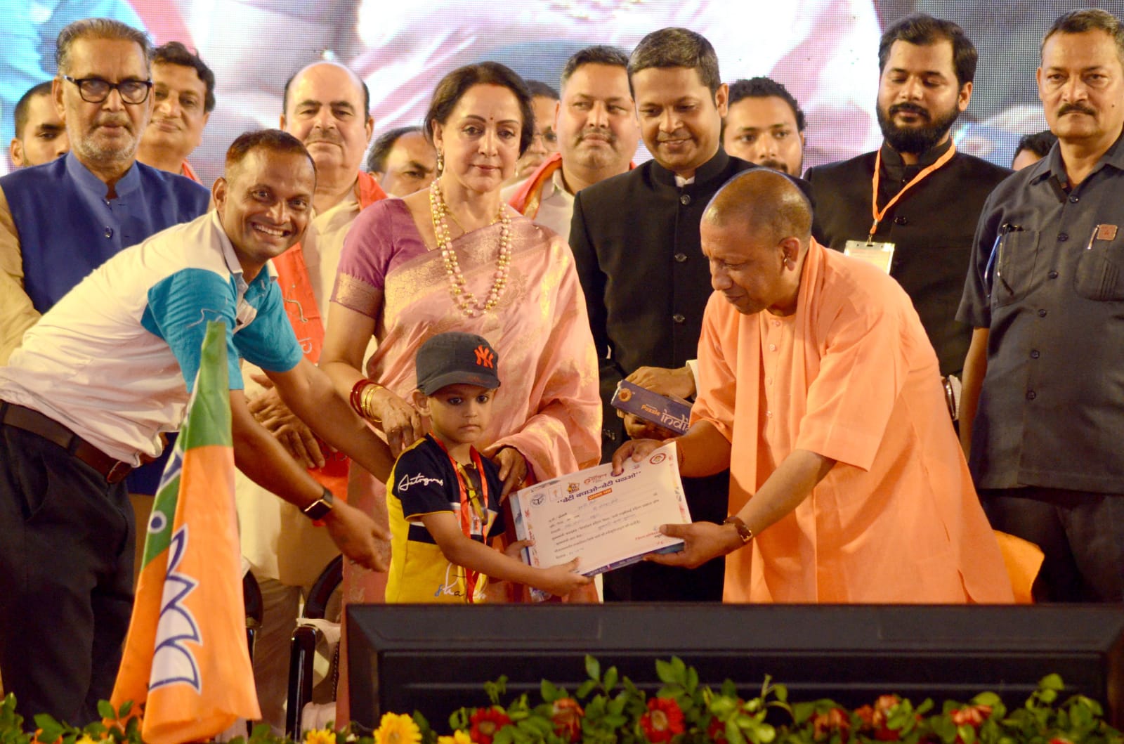 मुख्यमंत्री ने कार्यक्रम में सरकारी योजनाओं के लाभार्थियों को प्रमाणपत्र वितरित किये, इसके बाद 208 करोड़ की 80 परियोजनाओं का बटन दबाकर लोकार्पण और शिलान्यास किया जिसमें 121 करोड़ 51 लाख रुपये की लागत की 41 परियोजनाओं का लोकार्पण किया और 86 करोड़ 46 लाख की कुल 39 परियोजनाओं का शिलान्यास, मुख्यमंत्री योगी आदित्यनाथ ने इन पूरे कार्यों में लगन से काम करने के लिए सभी को धन्यवाद दिया, सांसद हेमामालिनी ने कहा कि यह नौ वर्ष का कालखंड ऐतिहासिक रहा है जिसके हम सभी साक्षी बने हैं, भारत आगे बढ रहा है, प्रधानमंत्री नरेंद्र मोदी और मुख्यमंत्री योगी आदित्यनाथ के प्रयास अनुकरणीय हैं, सनातन संस्कृति के साथ देश को आगे लेकर गये हैं, ब्रजवासियों के लिए काम करने का मौका मिला यह सौभाग्य है, अकेले मोदी सब पर भारी है। मोदी को हटाने के लिए विपक्ष एकजुट होकर बैठा हैं, कैबिनेट मंत्री चौधरी लक्ष्मीनारायण ने कहा कि भाजपाई जो कहते हैं वह करते हैं, 2014, 2017 का चुनाव लड़ा और मोदी ने स्पष्ट शब्दों में कहा था कि हमारी सरकार बनेगी, धारा 370 हटेगी, रामराज्य की परिकल्पना उत्तर प्रदेश में साकार हुई है, प्रदेश में रामराज्य है, 24 करोड़ जनता में एक व्यक्ति आज भूखा नहीं सोता है, प्रदेश में गाय और शेर एक घाट पर पानी पी रहे हैं, आने वाले समय में मुख्यमंत्री योगी आदित्यनाथ का विकास और मथुरा को योगदान याद किया जायेगा, उन्होंने मंच से मुख्यमंत्री से इशारों में छाता शुगर मिल को चालू किये जाने की घोषणा करने का अनुरोध भी किया ।
